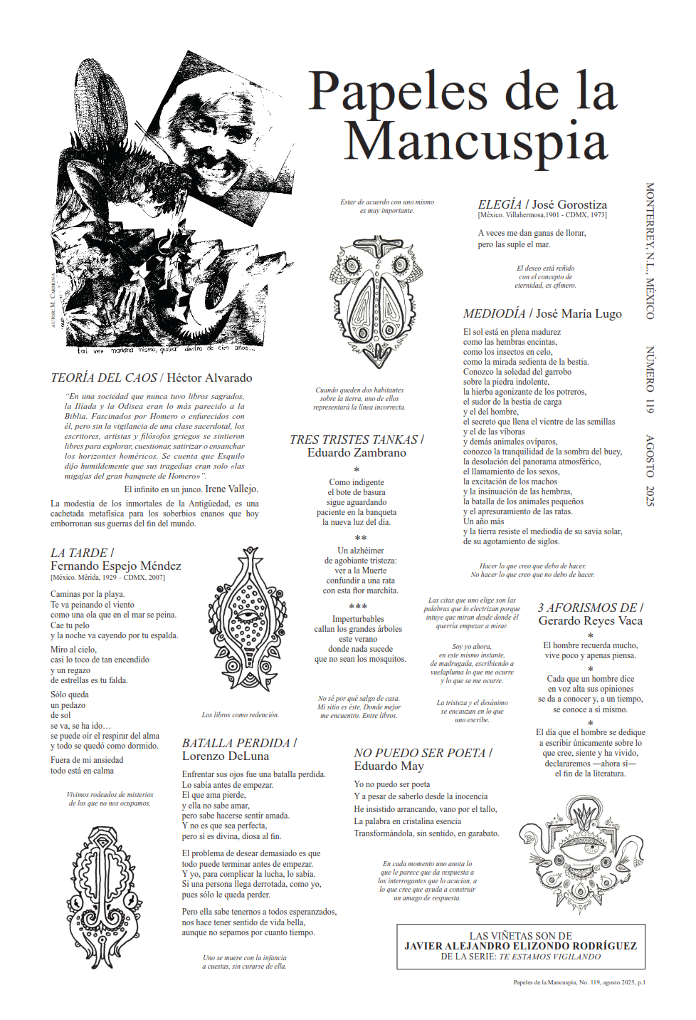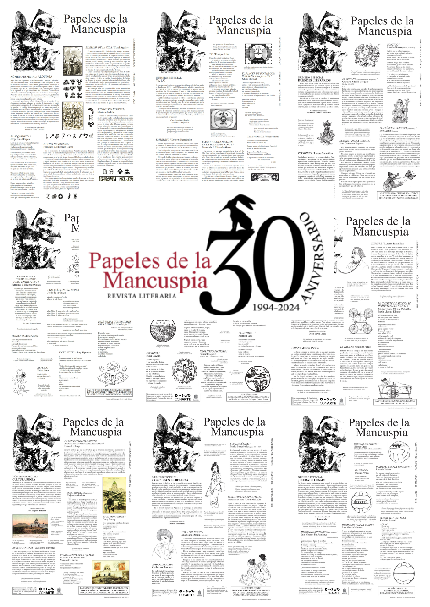 Papeles de la Mancuspia surgió en 1994 como una suerte de voz colectiva. Escritores e ilustradores enfrascados en un juego de mínimas proporciones pero de amplio alcance. Textos de una cuartilla como máximo, aforismos, poemas en prosa, poesía, avisos clasificados, cuadros escénicos y poesía. Juego dentro del juego, la Mancuspia proponía la brevedad en un formato desproporcionado para una revista, o bien indefinía su carácter enfundada en la camisa de un enorme tabloide, y tal vez esta peculiar inmanejabilidad, el múltiple espacio donde se escondían las escurridizas colaboraciones, los rincones donde saltaba un cuento brevísimo, una traducción, los dibujos monstruosos o delicados, hacía que no pudiera sino leerse de una sentada. imagen: Ximena Subercaseaux |